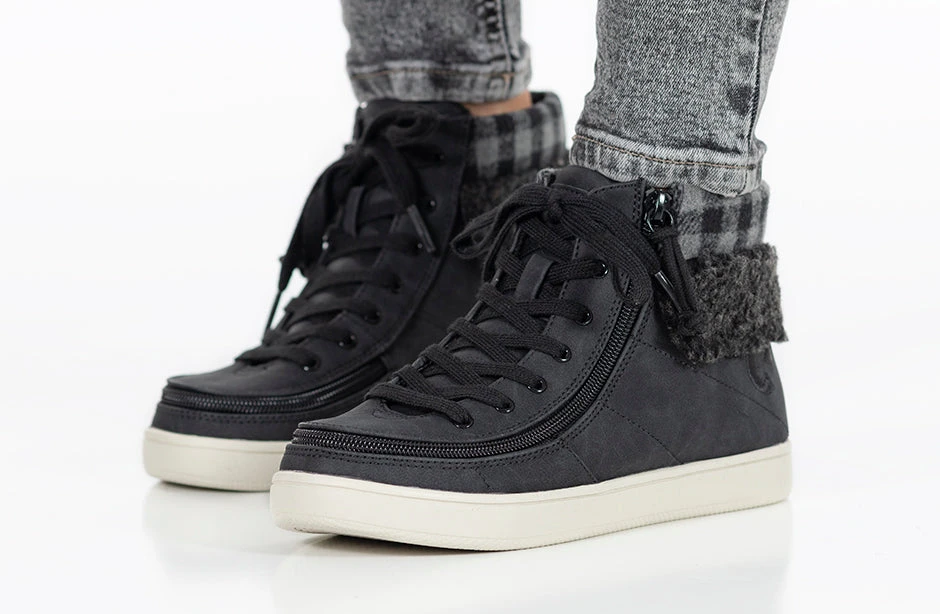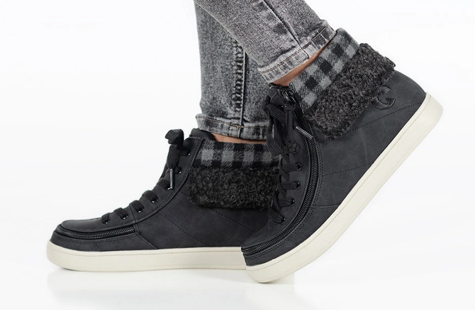A trendy look to the Classic High Top, the Women’s Black/Charcoal BILLY Cuffs are sure to receive compliments. Combining fashion with function, Step In! unobstructed in seconds. These flannel and faux suede kicks have a soft feel and fur collar for extra comfort. Use the functional laces to get the fit right, and then use the wraparound zipper henceforth. And with the multi-density foam and silica gel insoles, you’ll have cushion where you want it and support where you need it. Enjoy!